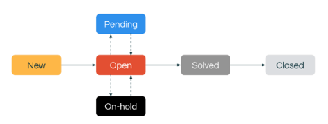 Un ticket peut passer par six étapes différentes au cours de son cycle de vie. Ce statut peut être défini et mis à jour soit manuellement, par un collaborateur, soit automatiquement, à l’aide de règles de gestion (Illustration 5).
