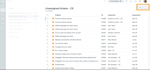 Le bouton Play vous permet d’afficher les tickets d’une vue de haut en bas, en ignorant ceux sur lesquels d’autres collaborateurs travaillent (Illustration 8). Vous pouvez ainsi aller plus vite en passant directement au ticket suivant après chaque résolution. L’utilisation du bouton Play optimise le workflow. Lorsque vous finalisez un ticket, vous en recevez immédiatement un autre au lieu de devoir revenir à vos vues et en trouver un nouveau.