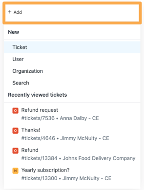 Voici une meilleure pratique à suivre pour résoudre les tickets dans Zendesk. Si vous avez besoin d’accéder à un ticket que vous venez de consulter ou de mettre à jour, placez votre curseur sur le bouton + Ajouter pour accéder à vos tickets consultés récemment (Illustration 11).