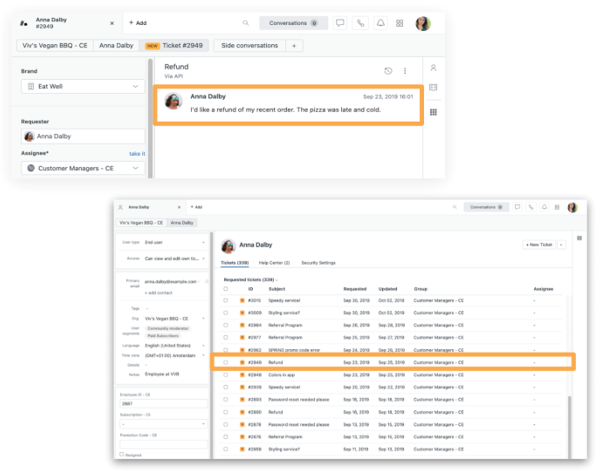 Imaginons que vous travaillez pour une entreprise B2C et qu’un client a demandé le remboursement de sa dernière commande (Illustration 13). En accédant au profil du client pour consulter l’historique de ses interactions et ses anciens tickets relatifs à des remboursements, vous pourriez déterminer si sa ou ses demandes ont pu être perdues.