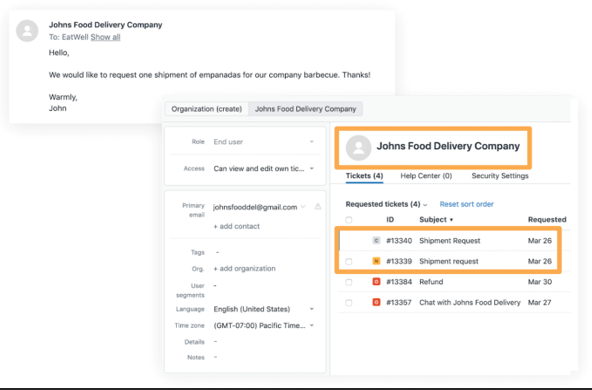 Vous pensez avoir reçu une demande d’expédition en double du même utilisateur (Illustration 14). Vous pourrez gagner un temps précieux et répondre à votre client de manière plus efficace en consultant son profil d’utilisateur et en vérifiant si une demande d’expédition a déjà été traitée. Vous constaterez peut-être qu’il est courant que cette organisation envoie deux demandes simultanément et que vous n’avez ainsi pas besoin d’approfondir vos recherches sur le problème. Quels que soient vos besoins, avoir accès aux tickets et événements passés peut vous aider à résoudre les tickets.