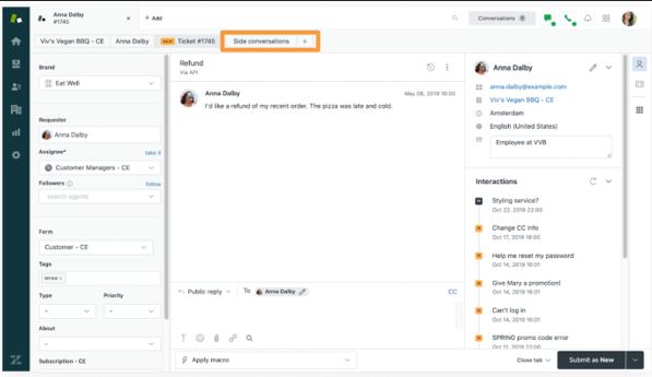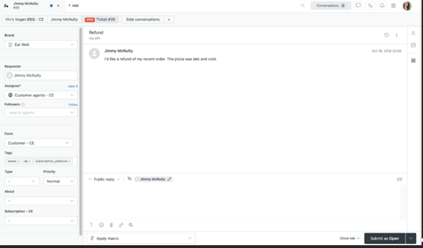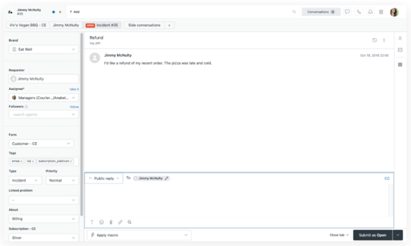 Réponse : En fonction de la politique de votre entreprise, vous pouvez effectuer un remboursement et informer le client par le biais d’une réponse publique, puis définir le ticket sur Résolu, ou contacter le fournisseur pour comprendre ce qu’il s’est passé (à l’aide d’une conversation annexe) et définir le statut sur En pause tout en informant le client (en réponse publique) que sa demande à bien été prise en compte et que vous allez revenir vers lui. Vous pouvez rédiger une note interne pour indiquer cela à votre équipe. Toutes ces actions sont faisables à l’aide d’une macro.