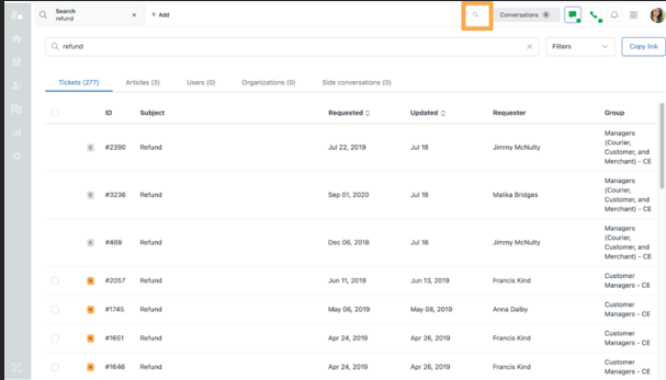 Enfin, vous pouvez utiliser la recherche en accédant à la barre d’outils supérieure et en localisant l’icône de loupe. Il vous suffit ensuite de saisir un mot et d’appuyer sur Entrée. (Illustration 10). Vous avez la possibilité de filtrer les résultats de la recherche par ticket, utilisateur, article et organisation. Vous pouvez mettre à jour les résultats de la recherche en masse. Pour obtenir plus de détails sur l’un des tickets, placez simplement votre curseur sur l’un des onglets de résultats de recherche. Vous verrez alors un aperçu rapide du ticket.