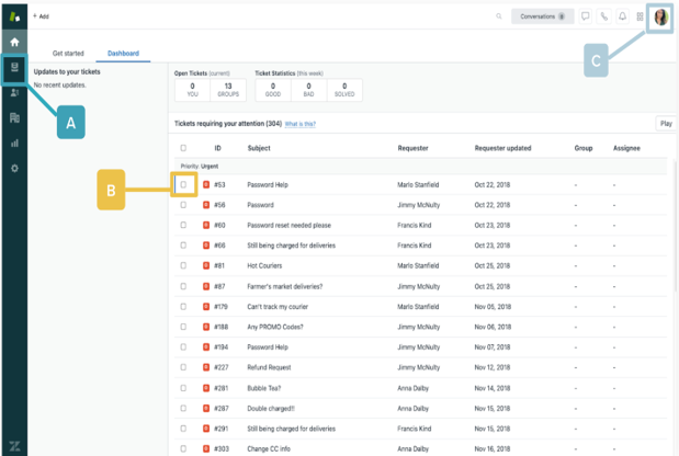 Pour accéder à vos vues, vous devez cliquer sur l’icône de dossier de fichiers dans la barre latérale gauche. Lorsque vous cliquez sur une vue spécifique, les tickets qui correspondent aux critères de cette vue apparaissent dans la fenêtre principale (Illustration 7).
