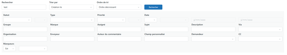 - Exemple : je souhaite rechercher tous les tickets avec le mot « test », je saisis « test » dans le champ « rechercher » puis je clique sur "Rechercher" en bleu puis je frappe sur ma touche « entrée »,