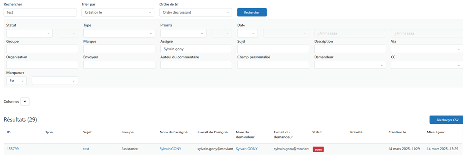 - je peux affiner ma recherche : par exemple, je ne veux afficher que les tickets avec le mot "création" dont l’assigné est "Sylvain Gony" , je saisis "Sylvain Gony" dans le champ "assigné" : il me propose alors 29 tickets,