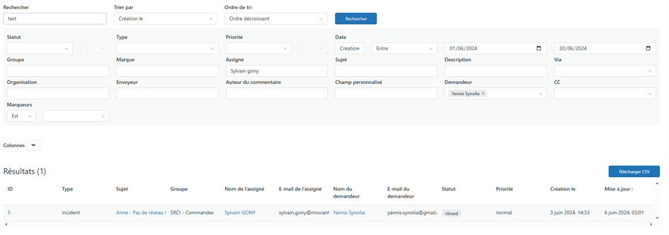 - je peux ajouter un critère de date en disant que je cherche un ticket créé au mois de juin par exemple :
