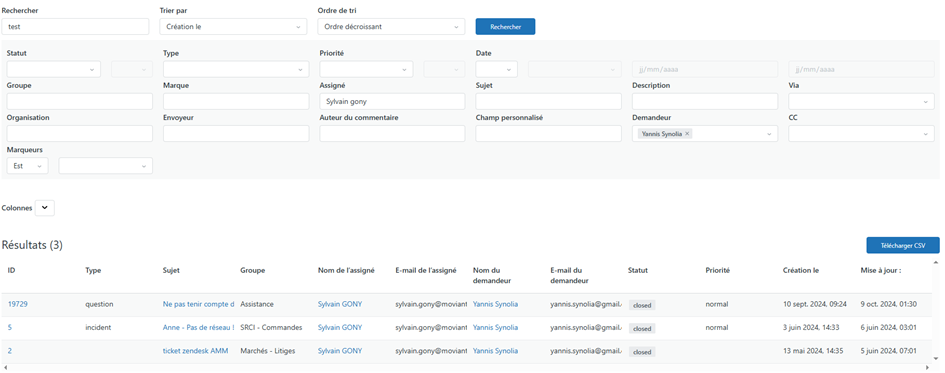 - je peux ajouter le nom du demandeur dans le champ "demandeur", par exemple "Yannis Baybaud" : il n’y a plus que 3 tickets :