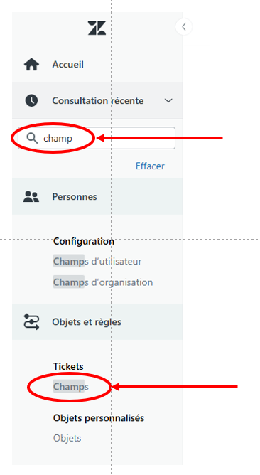 Etape 2 : dans le champ "Recherche dans le centre d'aide" en haut à gauche de la page d'administration, saisir le mot "Champ" puis cliquer sur le mot "Champs" sous "Tickets" sous "Objets et règles". La page d'administration des "Champs" de "Tickets" s'ouvre.