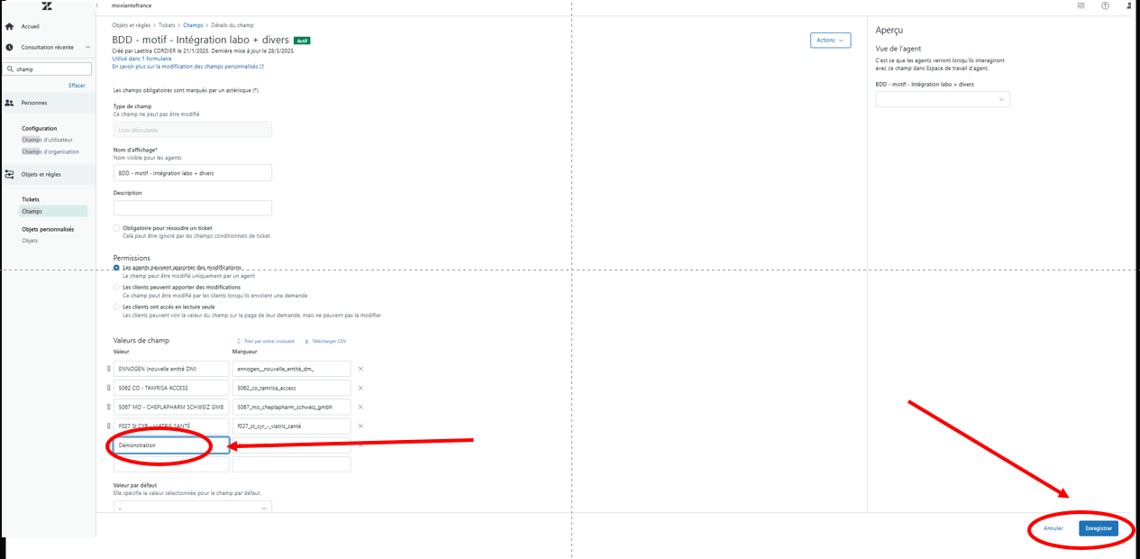 Etape 4 : Ajouter la nouvelle valeur que vous souhaitez voir apparaitre pour ce "champ", puis cliquer sur enregistrer en bas à droite de la page. Exemple pour une valeur intitulé "démonstration"