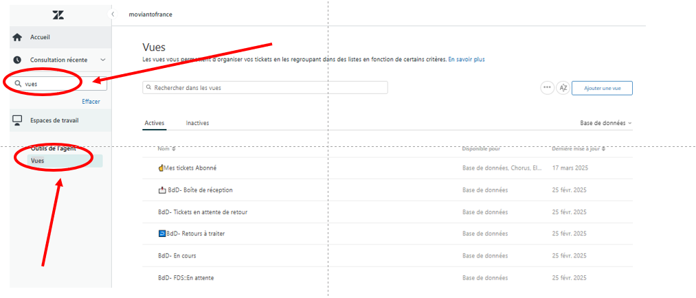 Etape 5 : dans le champ "Recherche dans le centre d'aide" en haut à gauche de la page d'administration, saisir le mot "Vues" puis cliquer sur le mot "Vues" sous "Outils de l'agent" sous "Espaces de travail". La page d'administration des "Vues" du pôle BDD s'ouvre.