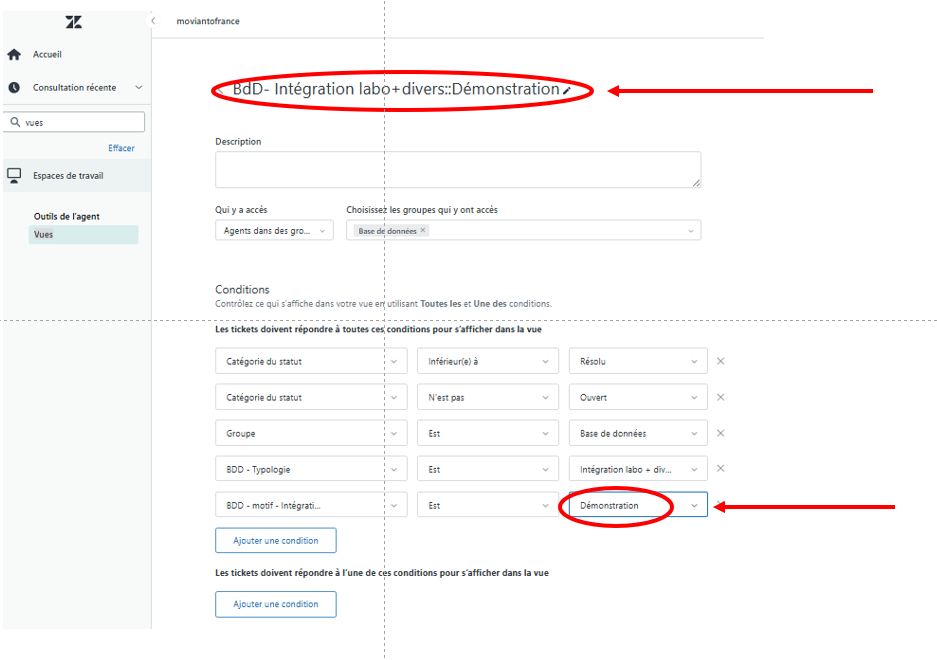 Etape 7 : il faut alors modifier le nom de la nouvelle vue que l'on souhaite avoir puis modifier la dernière conditions qui permet aux tickets de s'afficher dans cette vue. Ensuite il faut descendre en bas de la page pour enregistrer les modifications.