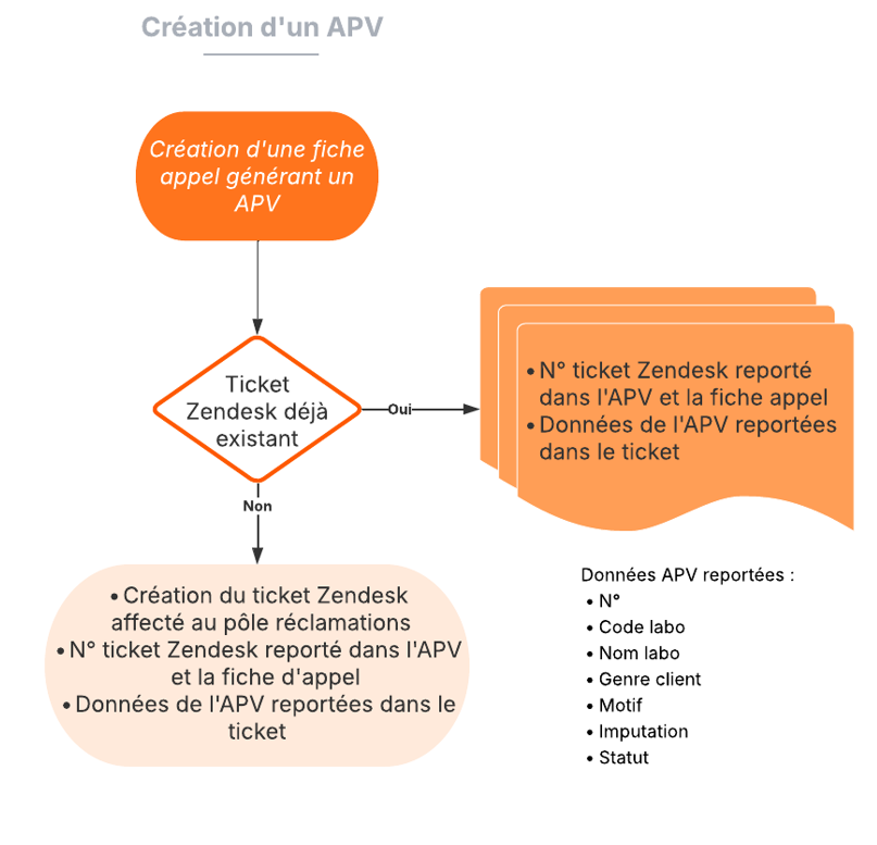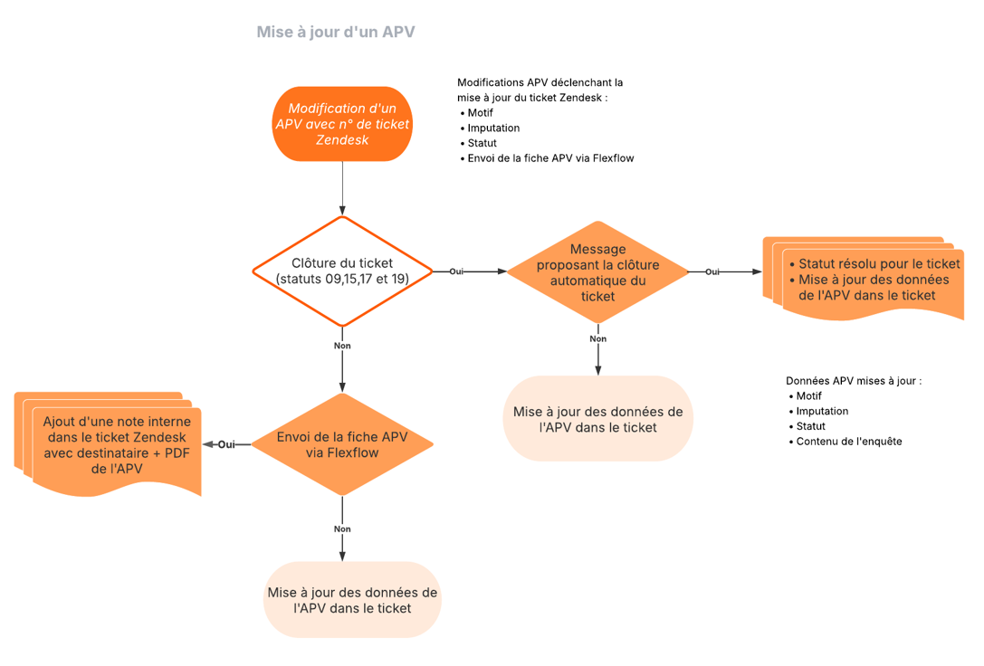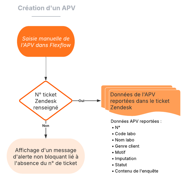 Afin de bénéficier pleinement des interfaces, les collaborateurs utilisant FlexFlow et Zendesk doivent ouvrir la page d'APV sur un écran et le ticket Zendesk sur un autre écran car chaque mise à jour du ticket Zendesk par flexFlow réouvrira le ticket concerné.