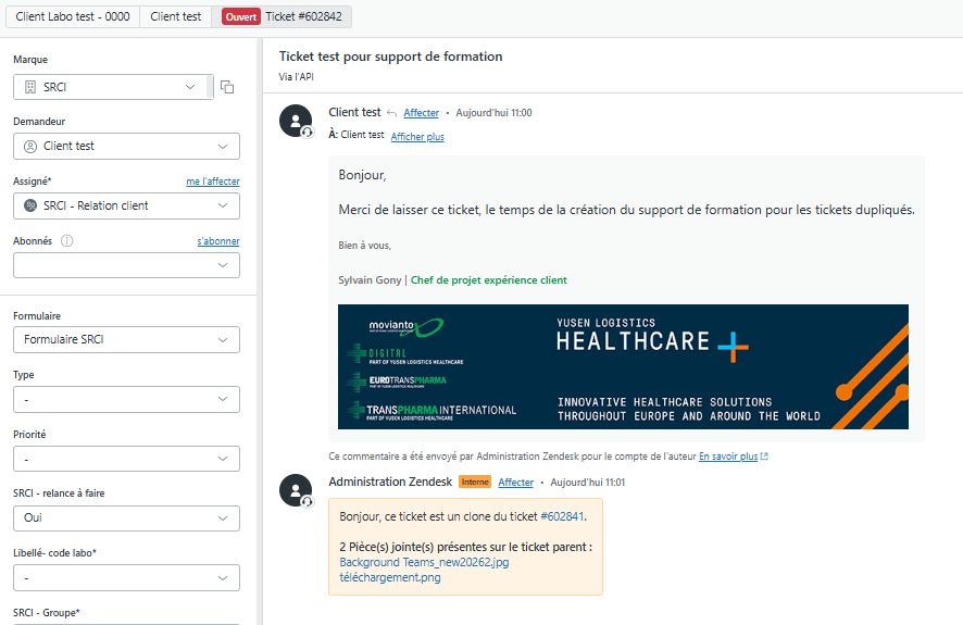 -un commentaire interne (orange) au nom de "Administration Zendesk" est créé juste en dessous du commentaire gris, il est composé de deux phrases, la première est toujours présente, la seconde dépend si le ticket dupliqué avait des pièces jointes ou non :