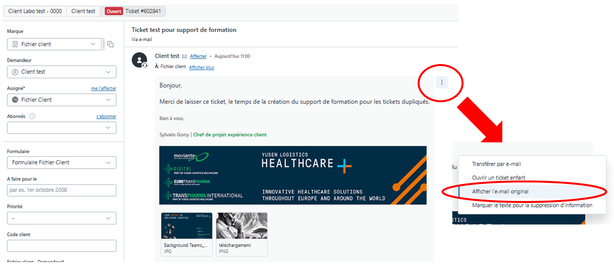 - Deuxième phrase : "2 pièces jointes présentes sur le ticket parent : suivi du nom des pièces jointes écrites en bleu" : pour ouvrir les pièces jointes, il vous suffit de cliquer sur les noms.