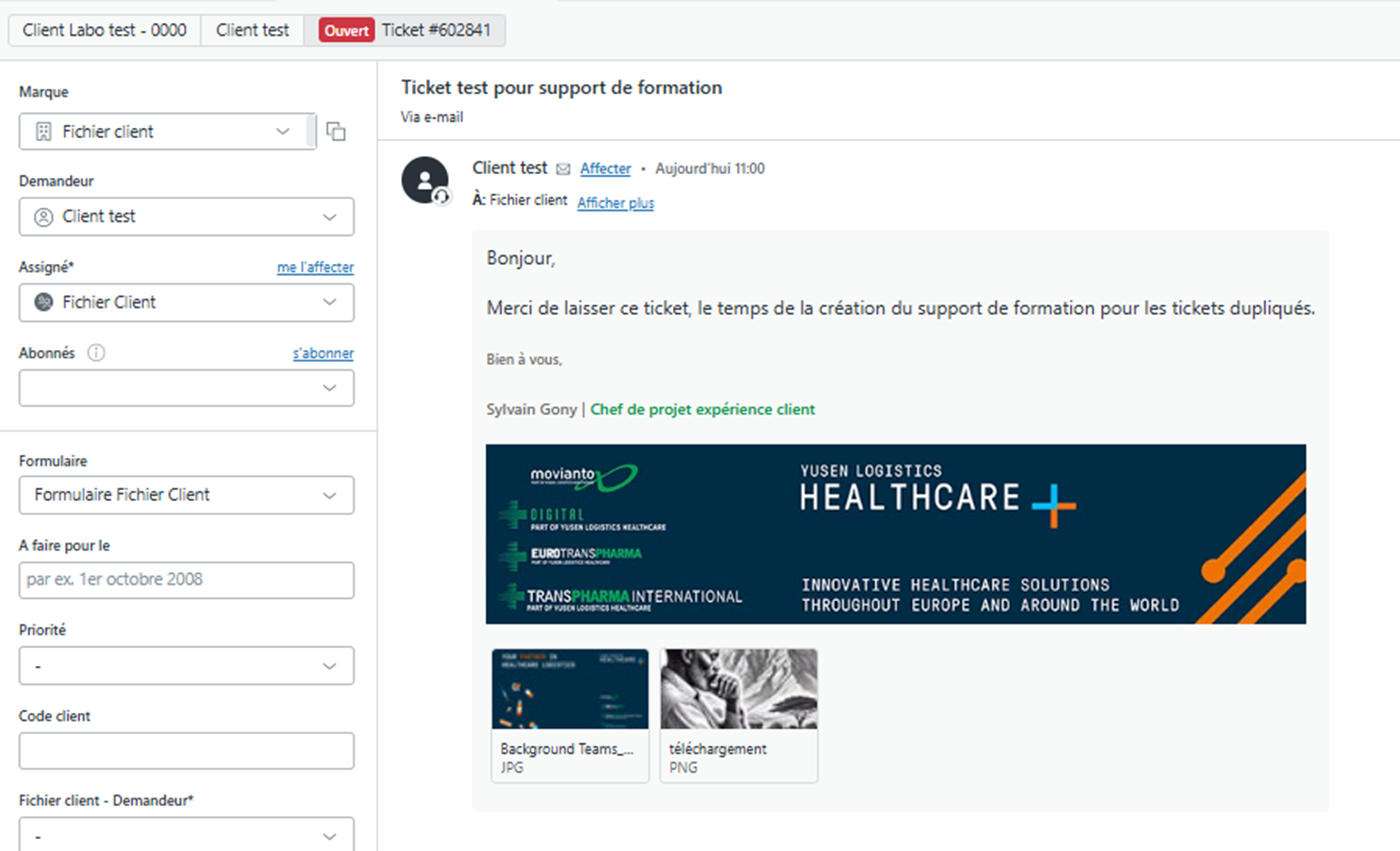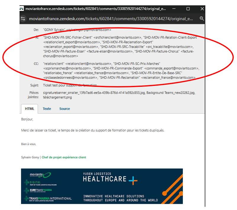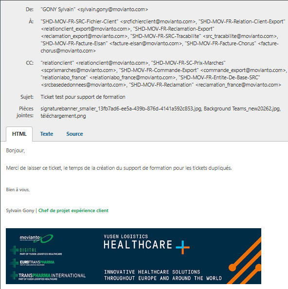 La deuxième adresse inscrite par le "client test" dans son mail est "relationclient_export@movianto.com", cette adresse reçoit un ticket dupliqué qui se présente comme suit :